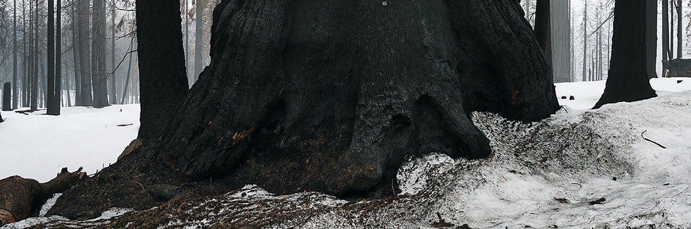 The anchor piece of Fire Complex is the multi-channel video work Cull. Cull follows the gigantic task of the clear up process after the 2020 Castle Fire that burned 174000 acres of Sequoia National Forest and destroyed 14% of the world giant sequoia population. It charts the efforts of the teams responsible for cutting down the dead trees left standing that are now endangering the remaining structures and roads. In an orchestrated choreography, each tree is documented as it comes crashing to the ground like a dead carcass, sometimes falling with such force that the earth beneath it shakes.