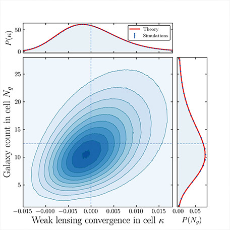 The image by Dr Lina Castiblanco Tolosa illustates joint statistics of foreground galaxy counts and the weak lensing of background galaxy shapes by the dark matter in the foreground. Gravitational clustering causes a skewed distribution of matter in the Universe: most regions have densities below average (dashed line), while some regions feature concentracted structures with much higher densities than average.